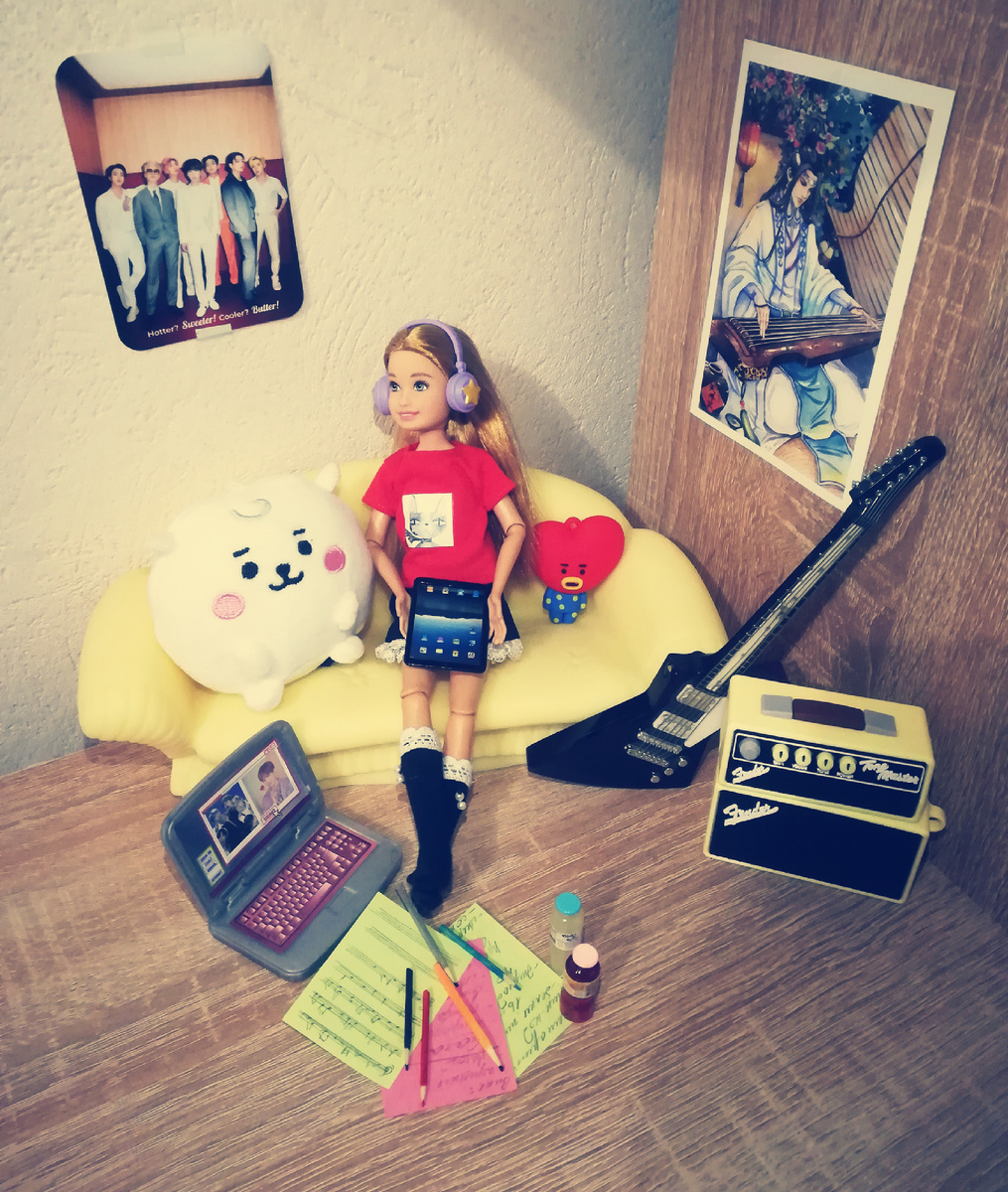 Леся любит слушать музыку, особенно свою любимую группу. Каждый день она включает наушники и погружается в мир звуков, мечтая о сцене и аплодисментах. Недавно она решила купить гитару, чтобы почувствовать себя частью музыки сама. Она с трепетом выбирала инструмент в магазине и наконец привезла его домой. Теперь каждое утро Леся тренируется играть любимую мелодию, несмотря на трудности. Ее мечта — научиться играть так же красиво, как ее кумиры на сцене. Она верит, что однажды сможет создавать музыку сама и делиться ею с миром.