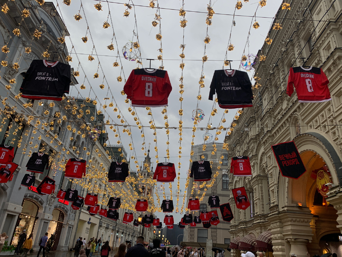 В XIX столетии эта часть города стала считаться одной из самых деловых. Но я сегодня не об истории и не об архитектуре улицы. Тема это долгая и глубокая Материала в интернете очень много. А я о том, что улица вдруг изменила свой облик. Что же это такое! Что это повесили? .Фамилия Овечкин попала на глаза сразу. Как интересно... Что же это? А , оказывается,Москву для открытия хоккейной площадки прилетел Александр Овечкин и в честь его вот так украсили улицу. Я далека от хоккея . Но , посмотрите, цифра 8 на майках красного и черного цвета - это майка хоккейного клуба Washington Capitals с номером 8, под которым выступает Овечкин, Думаю, все знают о выигранной Овечкиным премии американского телеканала за лучшее спортивное достижение. Александр Овечкин забил 897 шайб в регулярных чемпионатах НХЛ, поставив тем самым новый рекорд. До этого рекордное число голов было у канадца Уэйна Гретцки, которому удалось забросить 894 шайбы в НХЛ. Никольскую в таком новом дизайне я увидела неожиданно, проходя из Зарядья к метро Площадь Революции. Пройдусь еще не один раз , разгляжу все баннеры и об увиденном расскажу здесь, в ДЗЕНЕ,