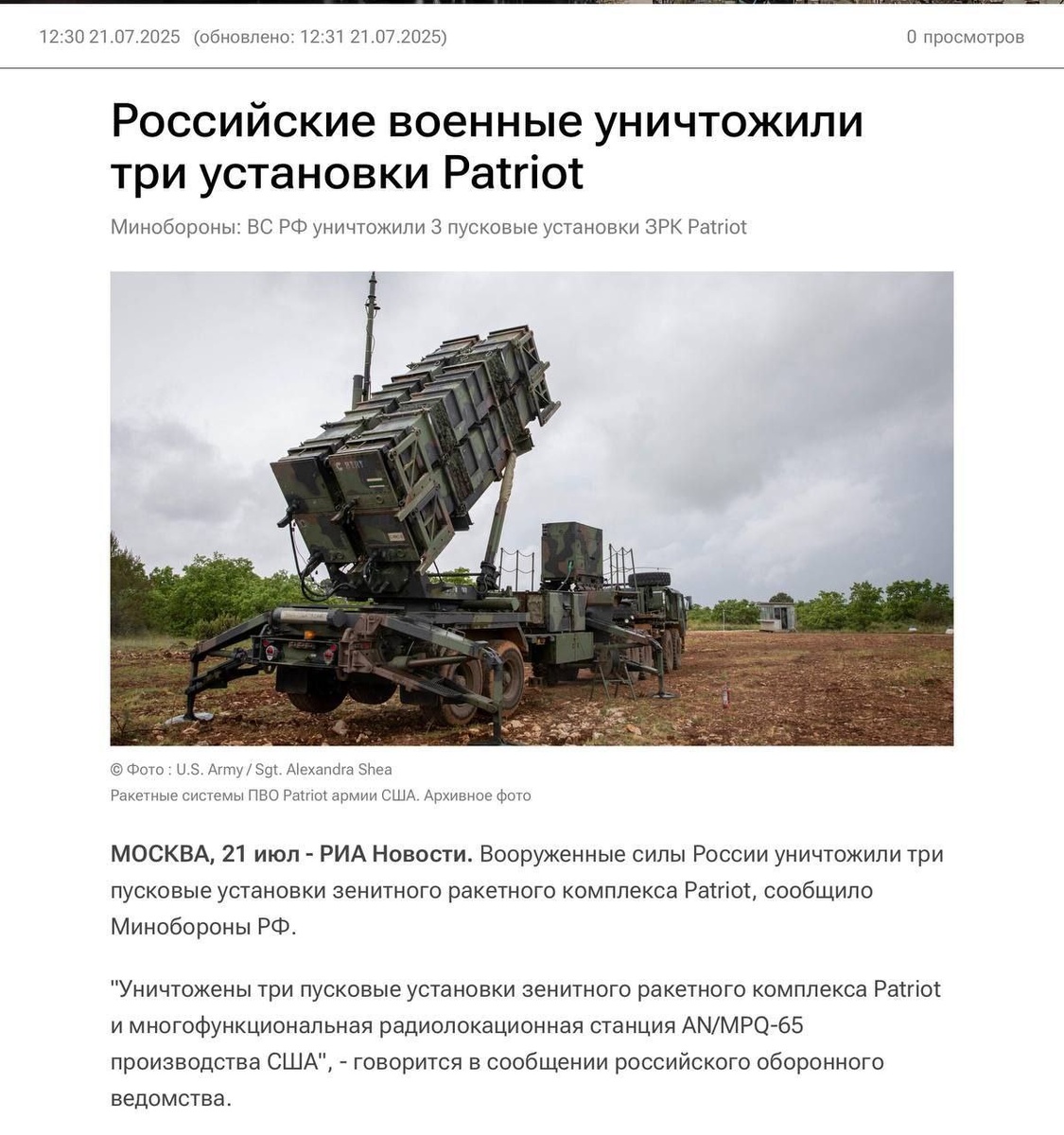 🪂 Уничтожены ТРИ пусковые установки ЗРК «Patriot» и многофункциональная РЛС AN/MPQ-65 производства США В Минобороны РФ сообщили, что оперативно-тактической авиацией, ударными беспилотными летательными аппаратами, ракетными войсками и артиллерией группировок войск Вооруженных Сил Российской Федерации уничтожены 3 пусковые установки зенитного ракетного комплекса «Patriot» и многофункциональная радиолокационная станция AN/MPQ-65 производства США. Одновременно нанесено поражение складам боеприпасов, цеху сборки беспилотных летательных аппаратов, территориальному центру комплектования ВСУ, а также пунктам временной дислокации украинских формирований, националистов и иностранных наемников в 142-х районах. Наше дело правое! Враг будет разбит! Победа будет за нами! 🫡 ▫️ Дневник Десантника