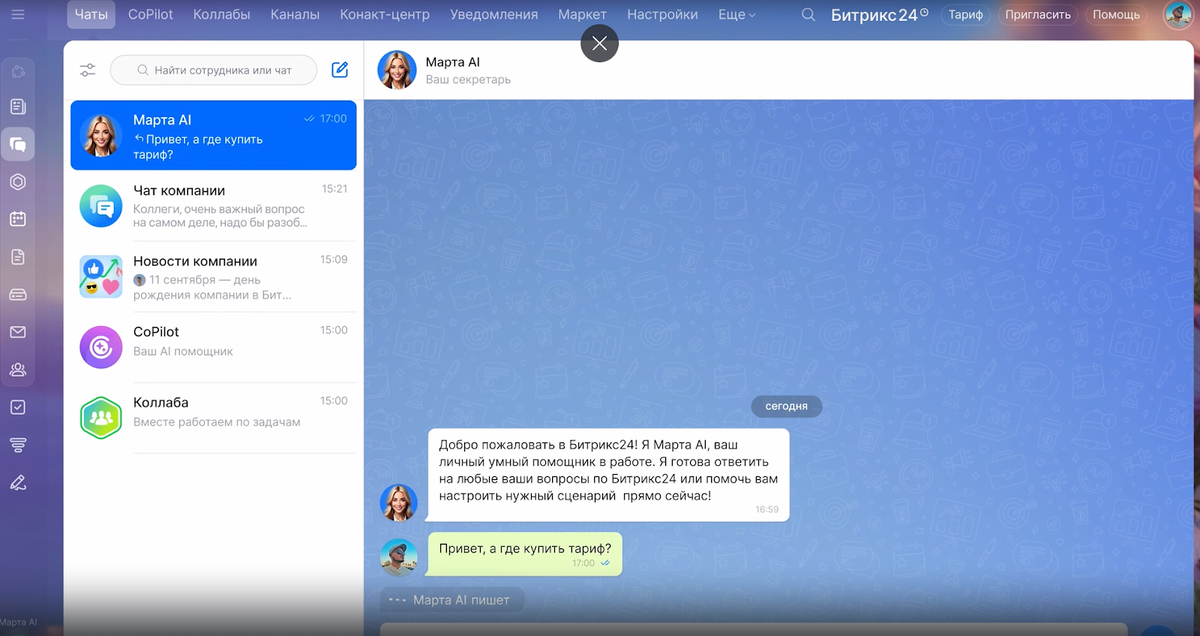 Марта AI — это виртуальный помощник, встроенный в интерфейс Битрикс24. Она работает на базе искусственного интеллекта и отвечает на запросы пользователя в реальном времени. Виджет с Мартой доступен в большей части разделов Битрикс24 — будь то CRM, задачи или бизнес-процессы.