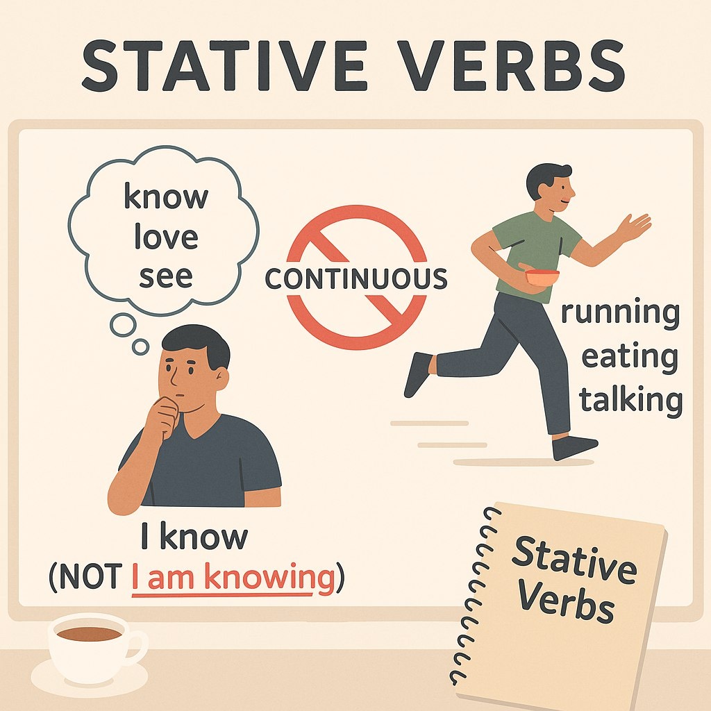 Вы когда-нибудь замечали, что фраза "I am loving this song" звучит странно, хотя носители иногда её используют? Всё дело в стативных глаголах (Stative Verbs) — особой группе, которая не сочетается с Continuous. Давайте разберёмся, как их правильно использовать! Это глаголы, которые описывают состояния, а не действия. Они выражают: ❌ Ошибка: "She is knowing the answer"