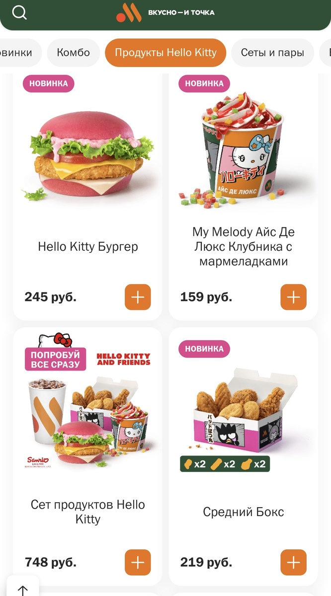 Всем привет! Сеть ресторанов быстрого питания "Вкусно и точка" я посещаю довольно часто, но в последнее время всё реже, тк реально цены выросли и растут постоянно. Это уже не то место, где дешево студенту можно перекусить. Но новинки я пробую постоянно. Заказ ВСЕГДА делаю в приложении, тк удобно, копятся бонусы, много акций и самое главное - не надо стоять ни в каких очередях. Например, с 21 тюля 2025г. появилось в меню новинки - средний бокс Hello Kitty, бургер Hello Kitty и мороженое Hello Kitty. Можно купить сразу всё в комбо, но я решила попробовать только бургер Hello Kitty. Да, кстати, можно подождать, когда появятся парные бургеры Hello Kitty, пара бургеров стоит дешевле, но мне хотелось побыстрее попробовать новинку. Бургер выглядит необычно для данной сети, поэтому мимо него точно пройти не получится. Ну, это если вы любите фаст-фуд. Всё собрано аккуратно, чему я рада, тк в последнее время конкретно в нашем ресторане грешат тем, что бургеры собирают криво и косо, ингредиенты