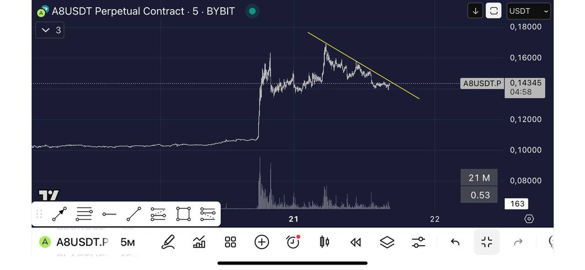 Монета пропампилась и наторговывает наклонный уровень в лонги. Буду искать твх в пробой наклонки.