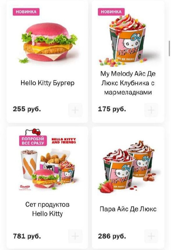 🍔💗 Во «Вкусно — и точка» стартовала коллаборация с Hello Kitty: тот самый розовый бургер уже в продаже. Стоит Hello Kitty бургер 255 рублей, полный сет Hello Kitty — 781 рубль, а My Melody Айс Де Люкс Клубника с мармеладом — 175 рублей. Будете пробовать?
