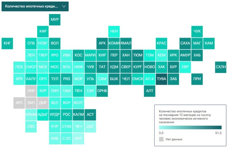 Лидером рейтинга стала Республика Тыва с показателем 51,5 ипотечного договора на тысячу жителей.