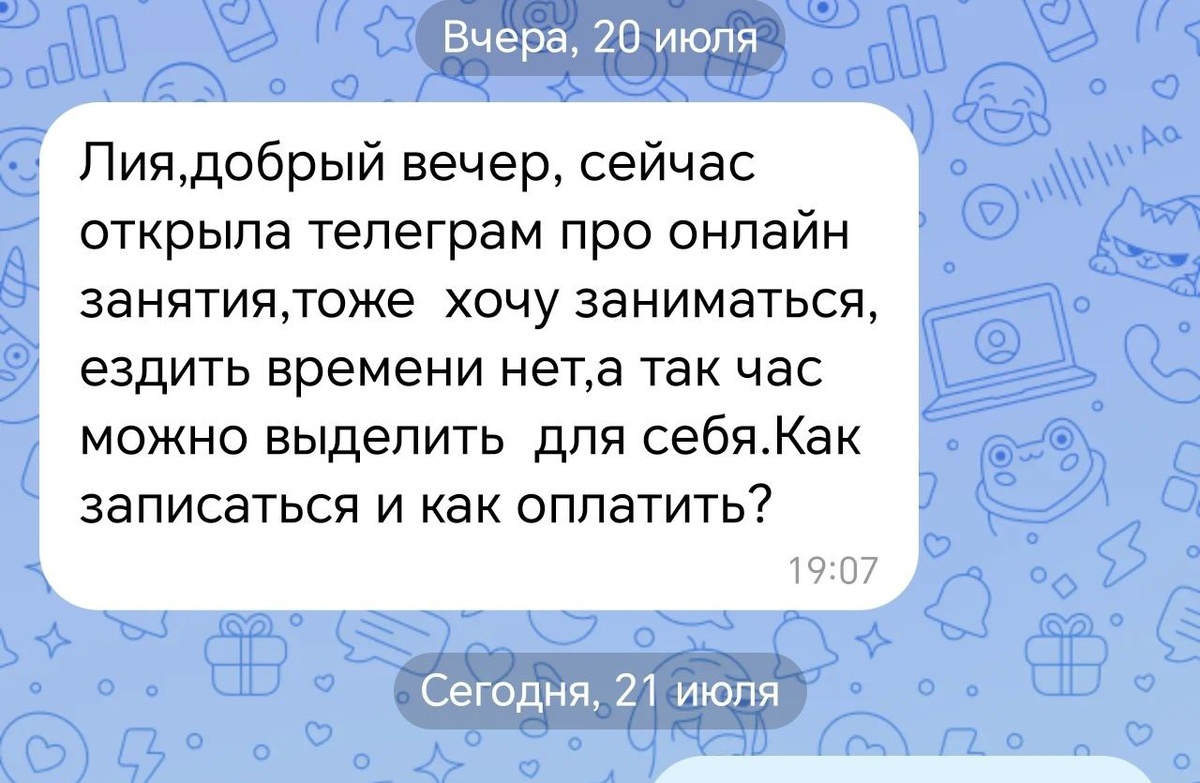 Дорогие, кто не успел записаться в воскресенье, организую дополнительную запись на 25е июля 6.30 в четверг с 10.00 до 20