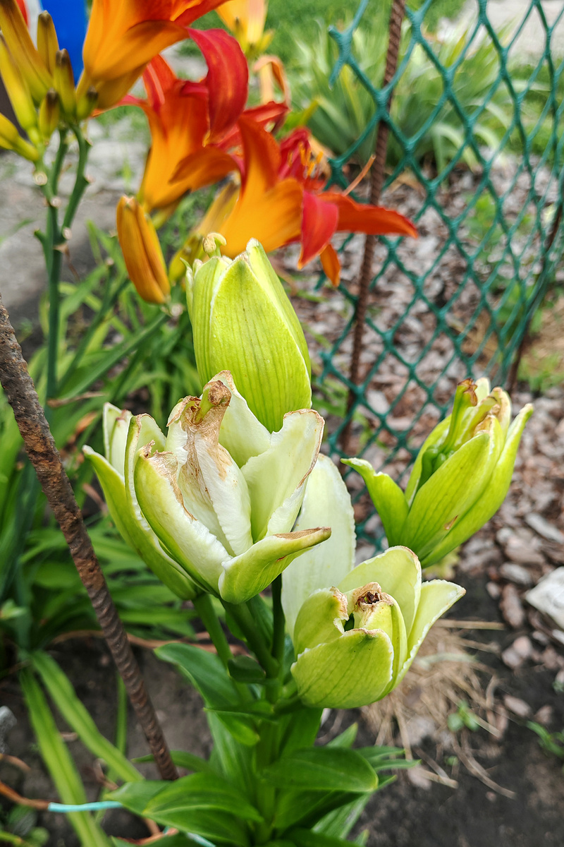 Лилия азиатская "Аннемарис Дрим" набрала огромные бутоны, и тут неделя 35+. Итог - бутоны будто запеклись, подгорели сверху. Тут уже все, ничего не сделать? Или это не ожог, а болезнь? От жужжалок и трещалок всяких обрабатывалась дважды.