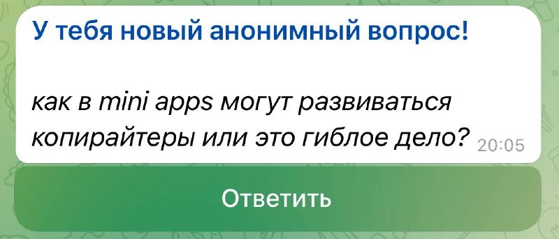 ❓Отвечаю на ваши вопросы #1 Я бы развивался как копирайтер в целом вокруг Telegram. В мини-аппс профессиональные тексты редко нужны, а вот для каналов это может быть полезно. Но нужно выстроить позиционирование, где будет четко понятно, почему стоит обращаться к тебе, а не юзать ИИ