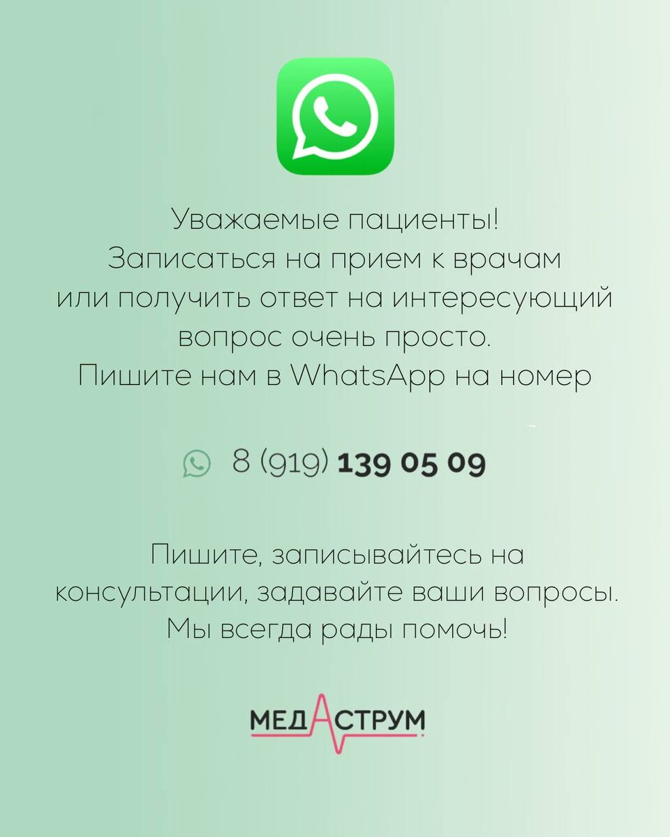 Уважаемые пациенты! Записаться на прием к врачам или получить ответ на интересующий вопрос очень просто. Пишите нам в WhatsApp на номер +7 919 139-05-09 Пишите, записывайтесь на консультации, задавайте ваши вопросы. Мы всегда рады помочь! ЗАПИСАТЬСЯ
