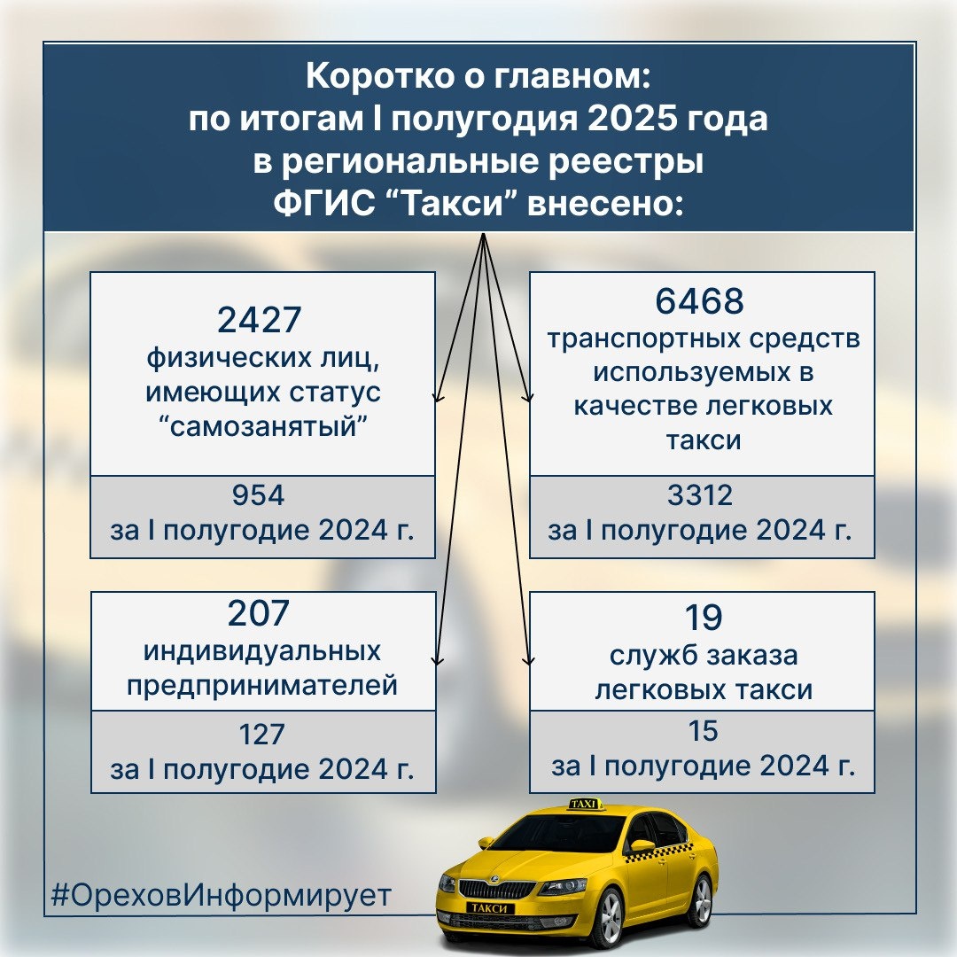 Коротко о главном... Цифра дня… 📝За I полугодие 2025 года в Федеральную государственную информационную систему легковых такси (ФГИС «Такси») сотрудниками управления внесено: 📌В качестве перевозчика: - индивидуальных предпринимателей - 207 (6 мес. 2024 г. – 127, увеличение в 1,6 раза). - физических лиц, имеющих статус «самозанятый» - 2427 (6 мес. 2024 г. – 954, увеличение в 2,5 раза). 📌Транспортных средств, используемых в качестве легковых такси – 6468 (6 мес. 2024 г. – 3312, увеличение в 1,9 раза). 📌Служб заказа легковых такси – 19 (8 Юр.лиц и 11 ИП) (9 мес. 2024 г. – 15 (8 Юр.лиц и 7 ИП). #Калужскаяобласть #УАТК #УАТК40 #ОреховИнформирует #Такси40 #Орехов