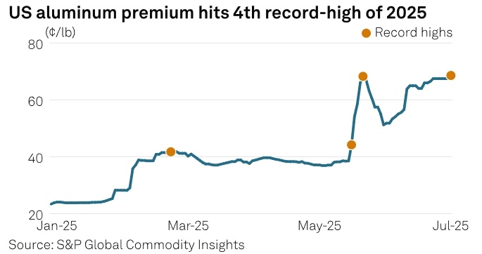 Чтобы компенсировать тарифы премия цены в США к цене в Лондоне должна вырасти еще больше. Цена алюминия в США достигла рекорда на фоне сокращения запасов и неопределенностей в замене импорта По данным Platts, премия цены алюминия в США к цене алюминия на Лондонской бирже металлов (LME) выросла до рекордно высокого уровня в 68,25 цента/фунт, поскольку рынок продолжает искать жизнеспособные варианты замены на фоне меняющихся сценариев торговых потоков. Текущая премия на 0,25 цента за фунт выше предыдущего рекорда, достигнутого 6 июня, шесть недель назад. Президент США Дональд Трамп подписал 3 июня указ, увеличивающий с 4 июня тарифы на импорт алюминия с 25% до 50% из всех других стран происхождения этого металла. После удвоения импортных пошлин участники рынка постоянно указывали на возросшие затраты на замену, как на фактор роста стоимости автомобилей даже в условиях неопределенного спроса. Тем не менее, по словам источников среди трейдеров, основные показатели неоднозначны, поскольку