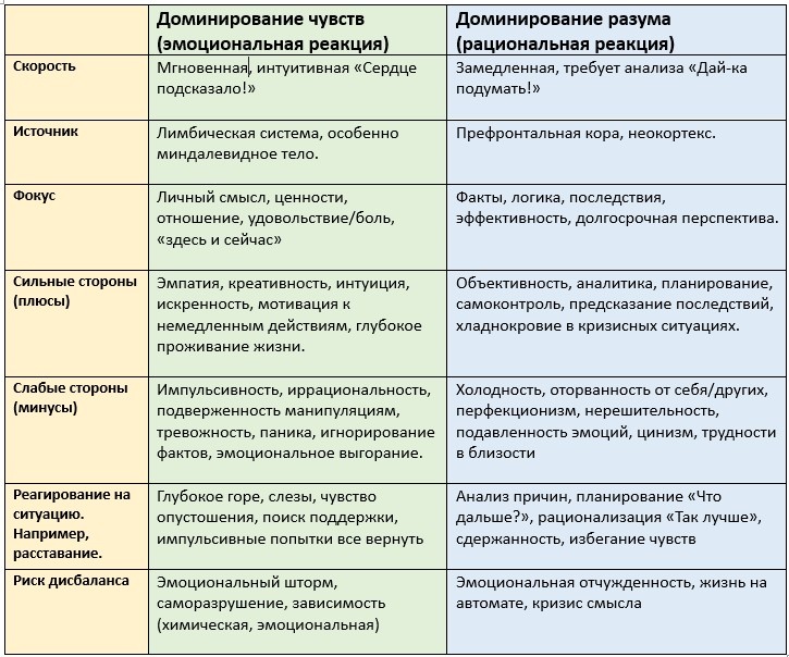 Сейчас много пишут о чувствах, о том, как важно слушать и слышать себя. Но иногда это может перерасти в крайности, когда люди слишком зацикливаются на своих чувствах или интерпретируют их буквально во всех ситуациях, что может мешать объективно оценивать происходящее или принимать взвешенные решения. Представьте, что вы на краю крыши высокого здания с прозрачным полом. Ноги подкашиваются от ужаса (это чувства кричат: "Спасайся! Опасно!"), но разум спокойно замечает: "Конструкция сертифицирована, статистика падений нулевая". Кто прав? Оба! И именно в балансе их голосов — ключ не просто к выживанию, но и к полноценной, осмысленной жизни. Почему же этот баланс так важен, и что происходит, когда один из "советников" захватывает власть? Баланс позволяет нам быть целыми. Чувства показывают, что для нас действительно важно (ценности, страхи, желания), разум помогает понять, почему и как действовать в согласии с этим. Без него мы либо бездушные роботы, либо хаотичные вихри эмоций. Чистый разум
