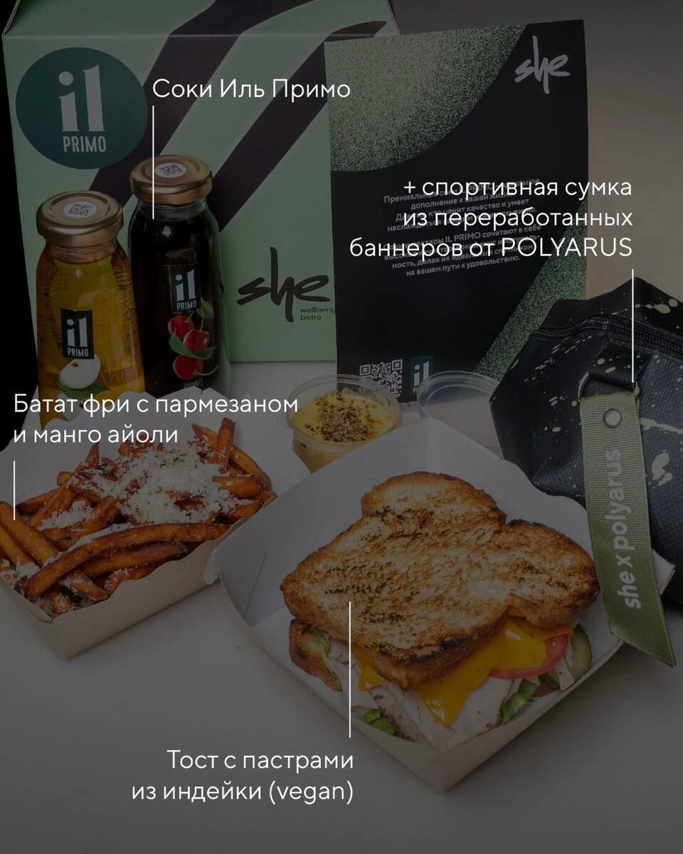 Хэппи милл для осознанных взрослых в московских ресторанах SHE Помните, в прошлом году отметились первые боксы для взрослых в московских ресторанах – в TEHNIKUM, например или в КОФЕМАНИИ? А вот эко бокс — это что-то новенькое. SHE в коллаборации с брендом POLAYRUS придумали наборы, чтобы и вкусно поесть и за экологию проголосовать рублём. В боксе тост с пастрами из индейки, батат фри, соки + спортивная сумка из переработанных баннеров. Стоимость удовольствия — 1990₽. Как вам идея? 👍 — гуууд 🤔 — очень странная история 🔗shemoscow 👉подписаться на @pridumali #foodмаркетинг