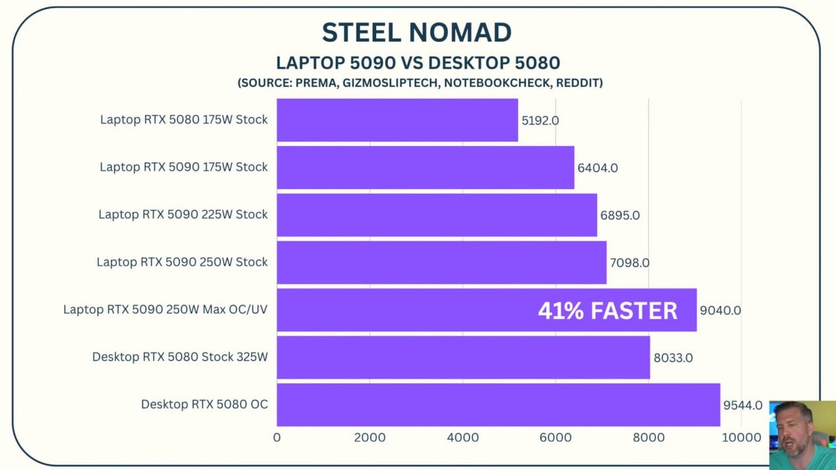 Через модификацию материнской платы ноутбука, можно заставить GPU поверить, что он потребляет меньше Ватт, чем на самом деле. Это называется шунт-моддинг, метод, который используется для постановки мировых рекордов, но при повседневном использовании весьма вероятно приведет к нестабильности работы системы, а в отдельных случаях и к выходу GPU из строя. Тем не менее, интересно, насколько ноутбучная "RTX 5090" (175W) может приблизиться к своему настольному прародителю RTX 5080 (325W) при шунт-моддинге (250W)? Как показал эксперимент дополнительной производительности, что позволяет обогнать базовую неразогнанную и неандервольтную настольную RTX 5080 в отдельных тестах. Естественно, если провести настройку десктопной RTX 5080, она все равно будет быстрее.