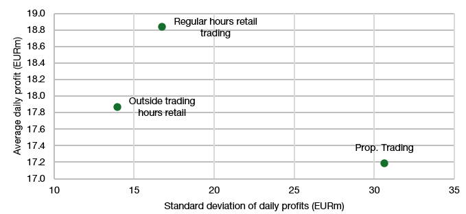 Каждый профессиональный трейдер и маркетмейкер обожает розничных трейдеров. Они — самые прибыльные контрагенты, иными словами, профессионалы наживаются на этих розничных трейдерах. Мы даже не представляем, насколько прибыльным на практике может быть маркетмейкинг для розничных трейдеров. Пару лет назад велись публичные дебаты о том, как Robinhood зарабатывает на продаже своего потока ордеров хедж-фондам и профессиональным маркет-мейкерам. А как ещё, по-вашему, они могли бы предлагать инвестиции без комиссии? Конечно, они продают ваши данные, чтобы другие могли совершать ваши сделки (при этом получая значительную комиссию для себя). Всегда помните: если продукт бесплатный, то пользователь и есть продукт. Питер Хоффманн из ЕЦБ и Штефан Янк из Deutsche Bundesbank использовали свой доступ к регуляторным данным по немецкому фондовому рынку, чтобы оценить, сколько денег зарабатывают специализированные розничные маркет-мейкеры на потоках розничных ордеров. На диаграмме ниже сравнивается средн