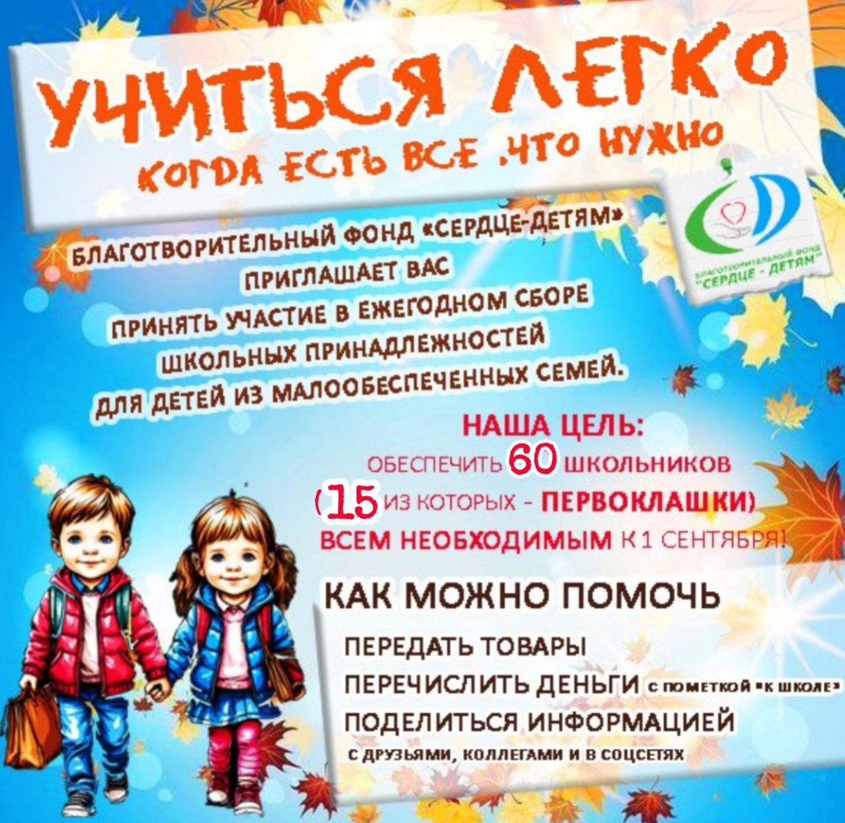 🍁🍂 Погнали благотворительный школьный марафон? 🍂 🍁 Объявляем открытым сбор школьных принадлежностей для детей из малообеспеченных семей! 🎯 Цель сбора: обеспечить 60 школьников (15 из которых - первоклашки) всем необходимым ко Дню Знаний! 🙏 Мы верим, что каждый ребенок заслуживает равные возможности для учебы и успешного старта в жизни. Ваше участие может помочь в этом! 🍁 КАК ПРИНЯТЬ УЧАСТИЕ? 🍁 🎓 Передать товары в пункт приема по адресу Люберцы, улица Хлебозаводская, 14А в будние дни с 9:00 до 17:00. В нерабочее время можно оставить товары в «Добробоксе» у КПП. Новые рюкзаки, тетради, ручки, карандаши, краски, альбомы для рисования, пеналы, ластики, точилки, цветные карандаши, обложки для учебников и тетрадей, линейки, клей, ножницы – всё, что пригодится ученику в школе. 🎓 Сделать денежный перевод с пометкой «к школе». Любая сумма будет ценным вкладом в доброе дело! Средства пойдут на закупку недостающих школьных принадлежностей. 💸 Отправить перевод 🎓 Поделиться инф
