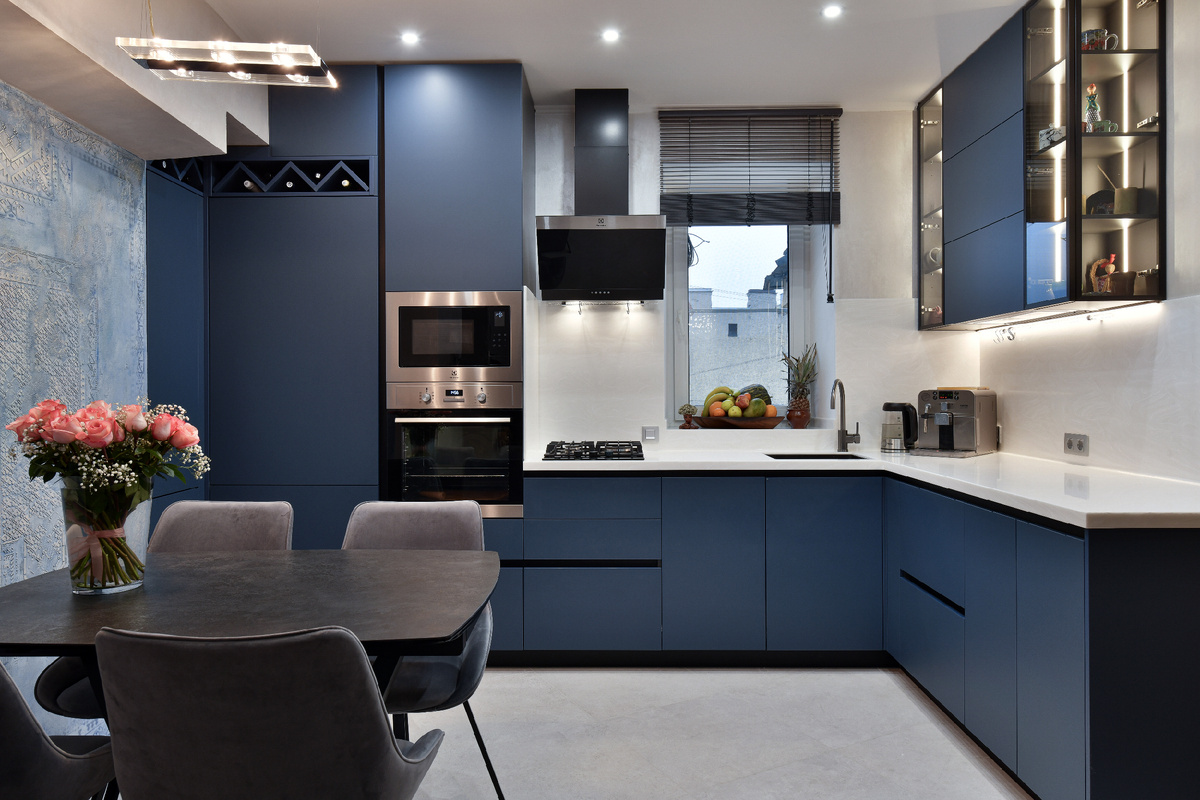 В этой рубрике показываем процесс создания нашей (точнее уже вашей ;)) красивой мебели. Сегодня это Синяя кухня для старого фонда. Помещение 17м2 в старом фонде с видом на крыши Петербурга. Необычные геометрия потолка и ниша. Большое желание клиентов сделать интерьер кухни более современным. Проект, созданный нашим дизайнером в Dуэте с клиентом. Ниша стала частью кухни и превратилась в функциональный шкаф. Техника встроена в пенал, обычный холодильник заменил встроенный шириной 70см. Глубокий синий цвет, профиль GOLA вместо ручек. Несколько витрин с подсветкой украшают интерьер. Готовая угловая кухня у клиентов дома: