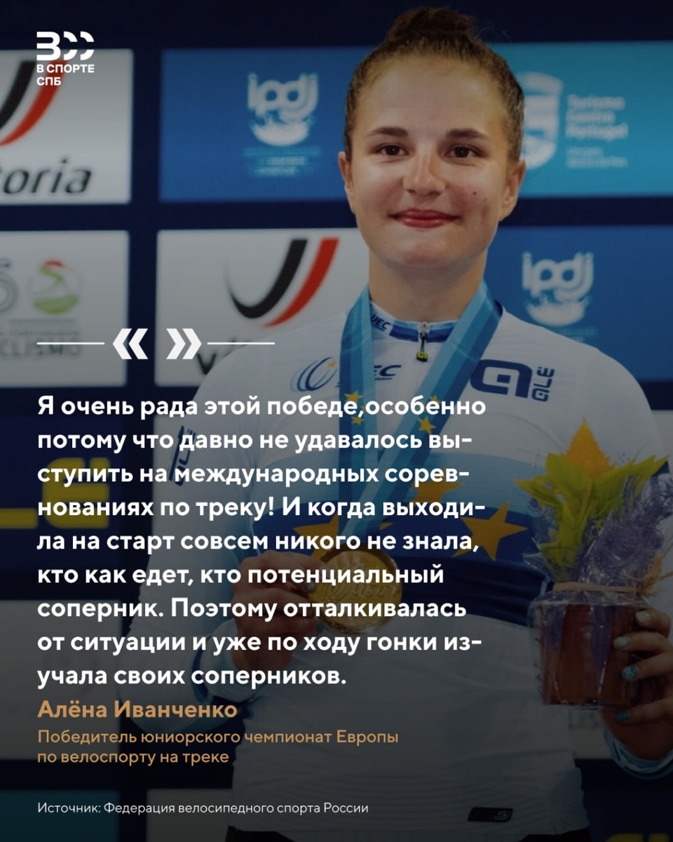 🎙 Алёна Иванченко поделилась впечатлениями от выступления на юниорском чемпионате Европы по велоспорту на треке. 🥇 Петербурженка завоевала золотую медаль в гонке по очкам среди спортсменов до 23 лет. Алёна набрала 54 очка и опередила ближайших преследовательниц испанку Айнару Бош (53 очка) и бельгийку Луку Фирстрэйт (41 очко). ... В общем ехала гонку «здесь и сейчас», в моменте. Конечно, немного расстроена, что это у меня был первый и последний старт в этой категории (андеры). Что не удалось побороться больше. И так же хотелось проехать побольше видов в Анадии. Но в целом очень рада этой медали! — приводит слова Иванченко пресс-служба ФВСР. 🇷🇺 Всего на турнире в Португалии петербуржцы завоевали 14 наград. Подробнее обо всех призёрах читайте ТУТ. 🙌Будь ВСпорте!