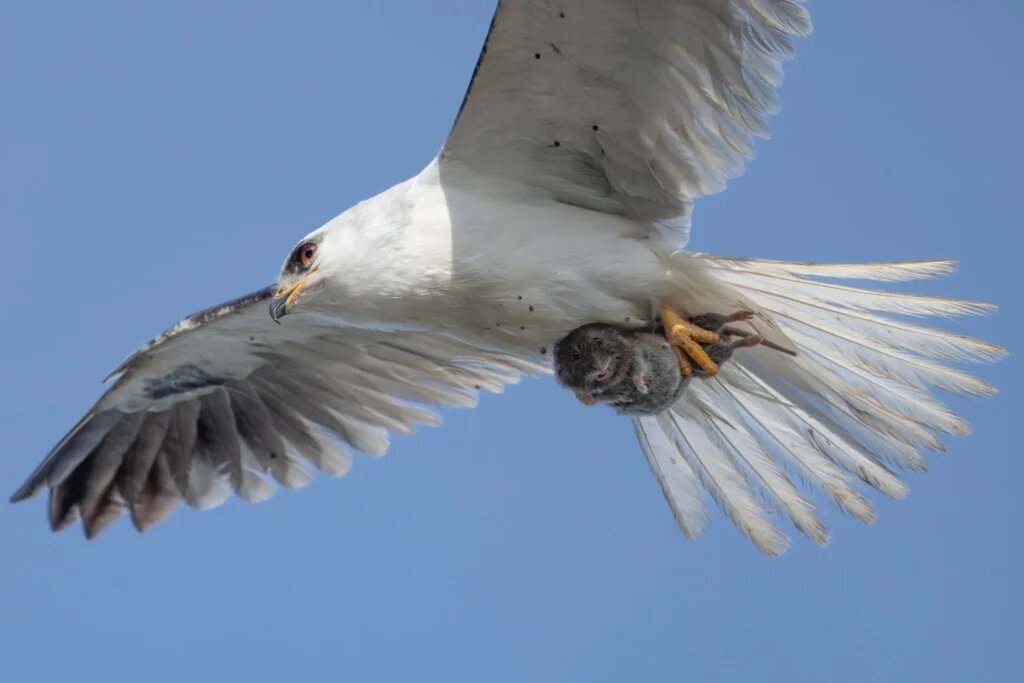 Фотограф дикой природы Ша Лу сделал уникальный кадр: несчастная полевка в лапах белохвостого коршуна. Фотография стала вирусной, в том числе, и в российских соцсетях. Многие впечатлились выражением мордочки мыши, напуганной и беспомощной в момент последних минут своей жизни. «На фотографиях запечатлён взрослый самец белохвостого коршуна, несущий полёвку. Это прелюдия к обмену пищей в воздухе с одним из его подросших птенцов (как это происходит — смотри в конце новости — прим. Photar.ru). Выражение морды полёвки показалось мне весьма впечатляющим: она была очень напугана и беспомощна, и, похоже, смотрела прямо в камеру», — рассказал фотограф Ша Лу. Особенно хорошо различимо выражение полевки при ближайшем рассмотрении: Полевки живут совсем недолго, всего несколько месяцев. При этом они — лакомая добыча для ястребов и других хищных птиц. Их едят еноты, змеи и лисы. Поэтому получившийся кадр — комбинация удачи и навыков фотографа, однако сама ситуация далеко не редкость. Хотя полевки не в