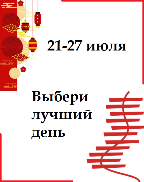 Понедельник – выберите одно дело и сделайте его от и до, тщательно выверяя все детали. Подходит для дел, требующих особой точности и внимания. Вторник – если в июле как-то все против вас, попробуйте выбрать для важного этот день, есть шанс, что на этот раз удача будет на вашей стороне. Среда – тенденции месяца ярко проявят себя, вспомните, что вы хотели сделать именно в середине лета, и больше не откладывайте. Четверг – упрямый и эмоциональный день, но зато можно добиться своего, стоит только захотеть и не отказываться от своего желания. Пятница – отличный день, чтобы подвести итоги недели и подсчитать свои накопления, а может быть даже вложить их во что-то более ценное.