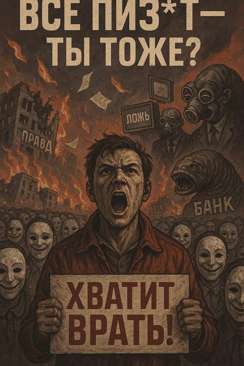 🚒 Пожарники врут. 🏦 Банки врут. Все крутятся как могут, выживают, выкручиваются — и всё это оборачивается массовым обманом. Каждый день с нас снимают дань в миллиарды 💸, а мы дерёмся за крошки. Кто мы после этого?.. Идиоты. Дебилы. Можете вставить свои любимые слова — по сути это ничего не изменит. 😤 🗣 Все матерятся, делают чушь, когда никто не смотрит. Все хотят тупо денег 💰, а власть ругают от зависти. Но, честно — если бы сами туда попали, стали бы лучше? Сомневаюсь. Люди гадят, врут, и делают вид, что они — приличные. Общество лицемеров. 🤥 И самое главное — ВСЕ ВРЁМ. Врём близким, друзьям, коллегам. Но при этом сами надеемся, что нам скажут правду. Абсурд? Полный. Вы не найдёте правды, потому что вы сами не умеете быть честными. Даже с собой. 😶 ❤️🔥 Вы врёте себе, кем вы являетесь. Притворяетесь, носите маски. Врёте мужьям и жёнам. Врёте детям. Врёте родителям. Повторяете за другими чужое враньё. Везде — одна ложь. Мы построили цивилизацию, основанную на вранье. 🌅 У меня