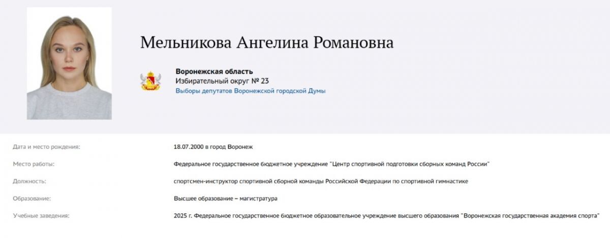 Воронежская гимнастка Ангелина Мельникова отказалась от участия в выборах в Воронежскую городскую думу. Девушка подавала заявку на 23-й округ. Об этом корреспонденту "Воронежских новостей" рассказали собственные источники. В мае 2025 года Мельникова набрала 1188 голосов по своему округу и выиграла праймериз. Однако теперь сняла свою кандидатуру. Одной из причин считают "реальную оценку своих сил". Когда Ангелина осознала все сложности избирательной кампании, девушка решила отказаться. Однако, как сообщают наши источники, сняла свою кандидатуру Мельникова также для того, чтобы не потерять нейтральный статус спортсменки. Ангелина Мельникова продолжит карьеру гимнастки и тренера. А вот ее место в округе, вероятно, займет Ольга Струкова, директор воронежской мега-школы. Ранее Украинский олимпийский комитет призвал отстранить воронежскую гимнастку Мельникову от участия в соревнованиях. Украинский НОК, федерация гимнастики и министерство молодежи и спорта посчитали выдвижение кандидатуры оли