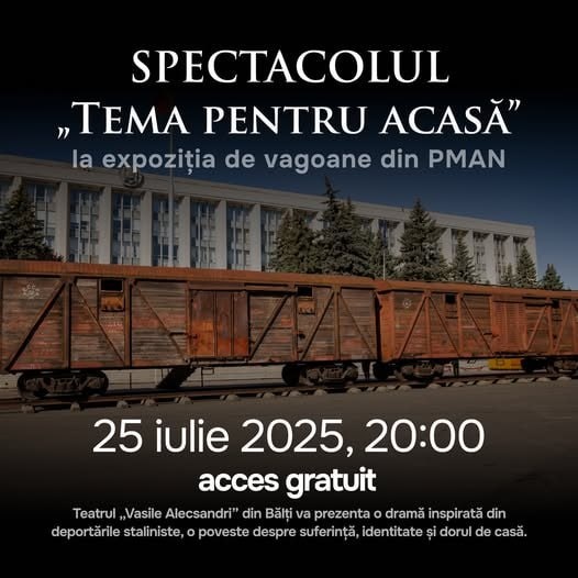 🎭 Депортации снова в афише. На этот раз — в театре. Прямо на площади. Если вы вдруг пропустили вчерашний фильм «Сибирь на костях» у парламента — не расстраивайтесь. Власти Молдовы продолжают прокачивать свою национальную идею-фикс: сталинские депортации теперь и в формате уличного спектакля. 🗓25 июля в центре Кишинева покажут драму «Домашнее задание» (по роману Николая Дабижа) — про любовь, ГУЛАГ, расстрелы, пытки и вагоны... 📍 Локация — площадь Великого национального собрания, где уже стоят «вагоны скорби». 🎟 Вход, разумеется, свободный. Память — дело святое, да. 💬 Сюжет: учитель румынской литературы и его бывшая ученица переживают репрессии и лагеря, но сохраняют чувства. Потому что никакая любовь не прочнее той, что на фоне НКВД и этапов в Сибирь. 🙄С такими темпами у нас скоро и утренники в детсадах будут с инсценировками арестов и ссылок. Историческая травма — это, конечно, важно, но когда её превращают в нескончаемый политический театр — начинает казаться, что других тем