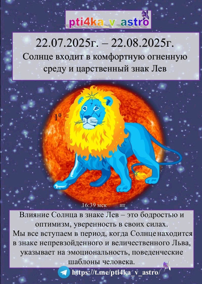 👑 "Королевское время" ☀️ Солнце во Льве ♌ с 22.07.2025г. 16:40 мск по 22.08.2025г. 23:33 мск ☀️ Солнце входит в яркий, творческий и амбициозный знак Лев ♌ 🏵️ С переходом Солнца в знак Льва - наступает время веселья, отдыха, отпусков и беззаботности 🏖️ ☀️ Время тепла и ярких праздничных событий 🦁 Врата льва 🦁 - период, когда можно заложить фундамент и начать жизнь по-новому, по-другому ⚡ Можно зарядиться энергией изобилия на целый астрономический год до следующего периода Или начать проживать жизнь по-другому, по-новому Согласно этого яркого, золотого Солнечного времени Меняйте свою жизнь вместе с Планетарным Новым годом когда на небе будут сиять два солнца 🌌 Вы сможете встретить Планетарный Новый год с нами ☀️ Прокачаете свои светила Солнце и Луну в этот яркий и позитивный период 🌙 🎁 Бонусом получите нумерологический расчет на год - в подарок 🌝 В Царское Новолуние июля приглашаю всех желающих на Волшебный Лунный марафон ✉️ Подробнее @pti4kavastro #солнце #оракул