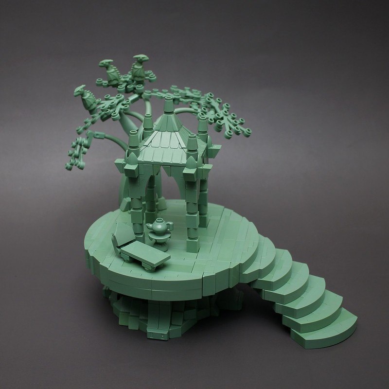 Волшебное убежище в монохроме от Duncan Lindbo 🧙♂️✨ Одна деталь — песчано-зелёная крыша — вдохновила на целую сцену: винтовая лестница, скамейка, чайник и уютный уголок для отдыха после магических практик. Выглядит так атмосферно, что хочется забраться внутрь! Источник: The Brothers Brick