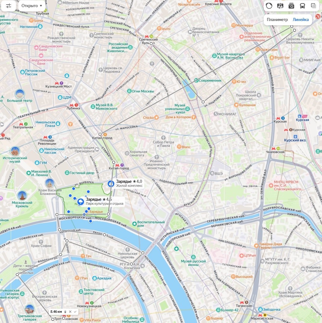 Мой маршрут в этот день выглядел примерно вот так: метро Чистые пруды - Сад им. Н.Э. Баумана - м. Китай город - Зарядье - Болотная площадь. Нашагала я примерно 9 км.