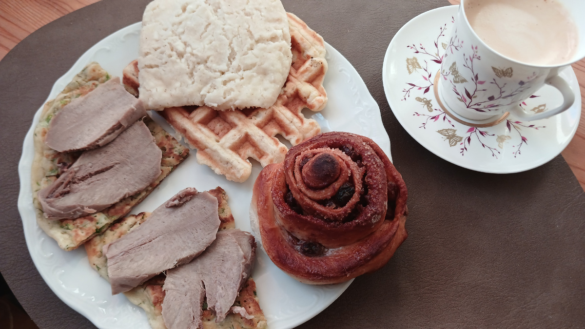 В июле тратим на питание одного человека 272 руб в день. Рассказываю, чем и как можно питаться на такую сумму. 😊 Завтракаем тем, что осталось от поездки. Мы вернулись домой только в 6 утра сегодня, сразу позавтракали. Тут кабачковые блины-бутерброды с языком, творожная вафля с бананом, сырник, булочка с изюмом и кофе Перекус - кофе, булочка и сыр все таскали из холодильника то, что осталось с поездки. Поэтому был только уже обедоужин в виде булгура с индейкой и нарезкой овощей на десерт - персики Меню год назад