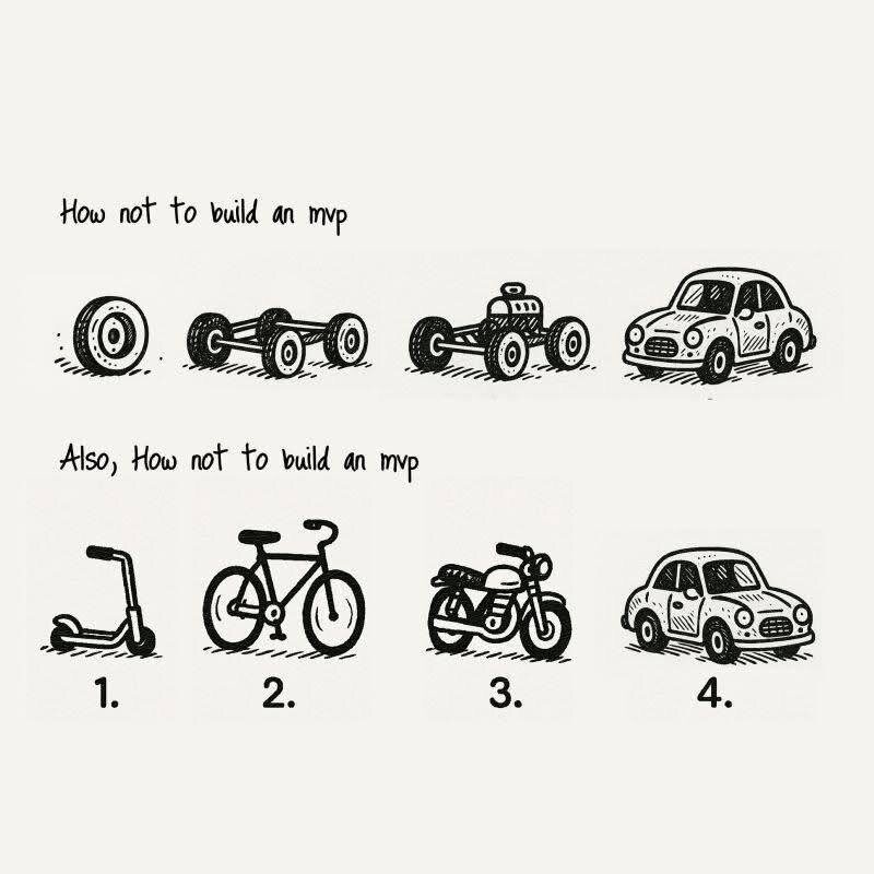 Я этот пост откровенно стырил у одного человека на экстремистской площадке. Но переиначил его по своему. Представьте себя ребёнком из маленького поселка сельского типа Мятлево, расположенного на пересечении Варшавского шоссе и Калужско-вяземской железной дороги, которому девять лет, и вы только что собрали пару яблок в первый рюкзак. Позади Яблочный Спас, последние тепле деньки и вы торгуете яблоками. Вы не строите завод по переработке плодов, не закупаете заставки и баннеры, не разрабатываете дорогущую упаковку. Вы встаете рядом с железнодорожным переездом с одной миссией — проверить, готовы ли люди платить за яблоко прямо сейчас. Вот вам и первый MVP: горсть яблок, рюкзак на плечах и смелость выйти к прохожим. Через пару попыток вы замечаете, что продавать вдоль трассы проще. Не гнаться за всеми и не толкаться с торгашами на рынке, а сосредоточиться на месте, где машины замедляются. Вы меняете стратегию — переносите точку продаж. Снова тестируете. Протестировав берете больше тары и