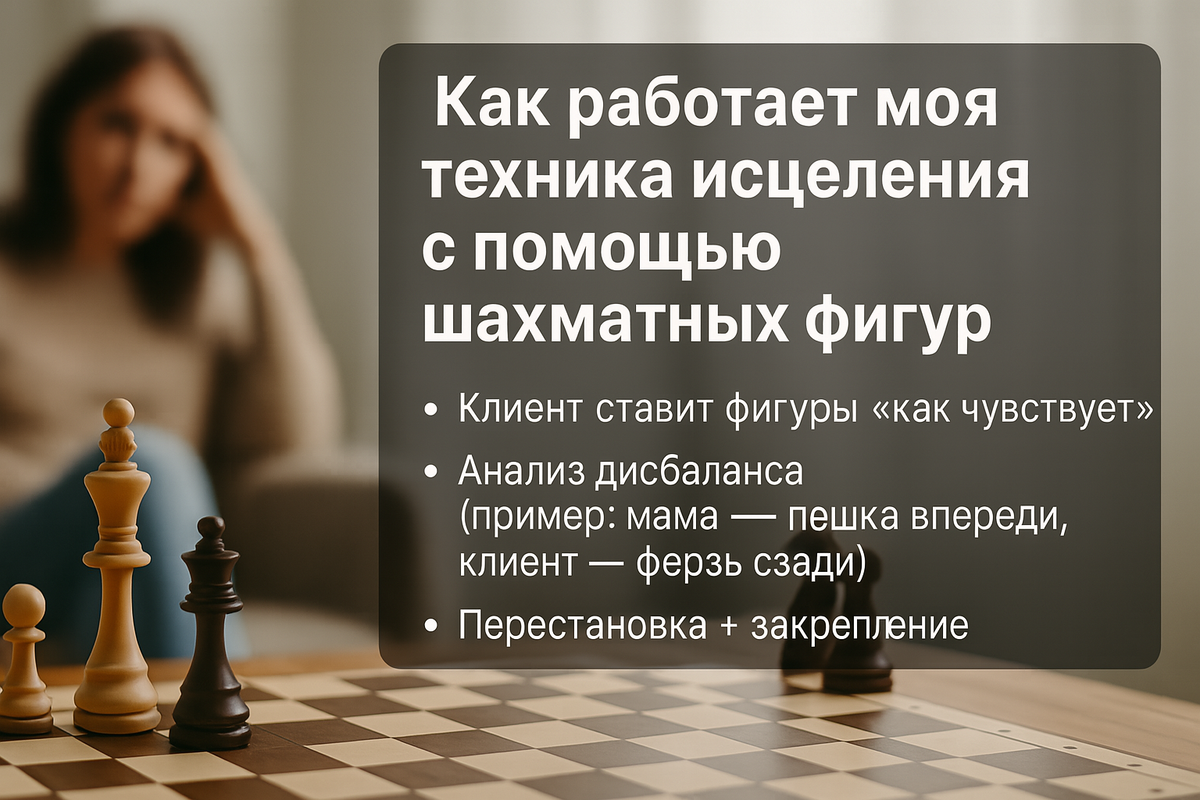 Когда клиентка ходила по врачам без результата, и её отправили домой умирать, а после одной сессии с шахматной доской её язва исчезла — я поняла: магия не в фигурах. Магия в том, чтобы увидеть бессознательное. И исцелить его. Наш мозг устроен удивительно: когда мы выносим внутренние конфликты во внешний формат, он начинает их воспринимать иначе. Это называется проекцией. Исследования MIT показывают: визуализация проблемы повышает эффективность терапии на 63%. Почему? Потому что бессознательное легче "раскодировать", когда оно не в голове — а на доске перед глазами. Именно поэтому шахматные расстановки работают особенно глубоко: вы не просто говорите о боли — вы её видите. И можете с ней работать. Многие слышали о расстановках Хеллингера. Но метод, с которым работаю я, отличается принципиально. Вот 5 ключевых преимуществ: Шаг 1. Клиент расставляет фигуры на доске "как чувствует". Например: мама — пешка, клиентка — ферзь, деньги — ладья. Шаг 2. Анализ структуры. Допустим, фигура мамы сто