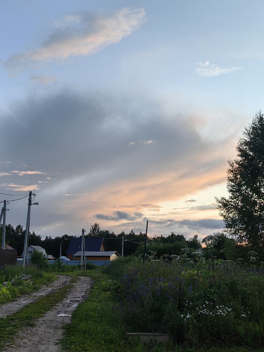 Летний вечерний сельский пейзаж (Комарово, Клин) #sky #blue #beforesunset #clouds #grey #beige #nature #rural #landscape #forest #road #Komarovo #Klin #summer #July #небо #голубое #передзакатом #облака #бежевые #серые #природа #сельский #пейзаж #лес #дорога #Комарово #Клин #лето #июль