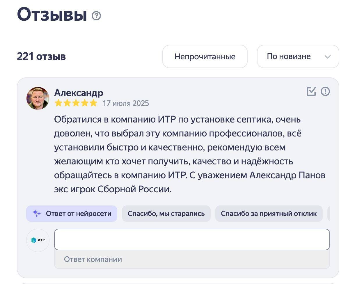 "Высокая оценка профессионализма: отзыв Александра Владимировича Панова, экс-игрока сборной России" 🌟 Благодарим Александра Панова за выбор и доверие к компании ИТР! 😊 Для нас было большой радостью помочь вам с установкой автономной канализации на вашем участке 🏡🚽. Ощущать, что наша работа делает жизнь комфортнее и проще — лучший стимул для всей команды! 💪✨ Спасибо за сотрудничество! #итр #отзывы@itr_rf