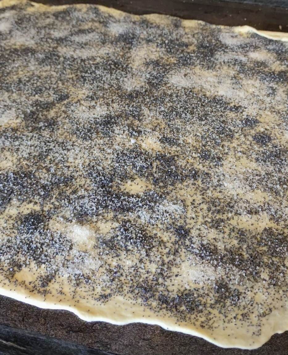 Маковые рулетики делаю так: раскатываю прямоугольник из теста, смазываю его растопленным сливочным маслом, посыпаю сахаром и маком.