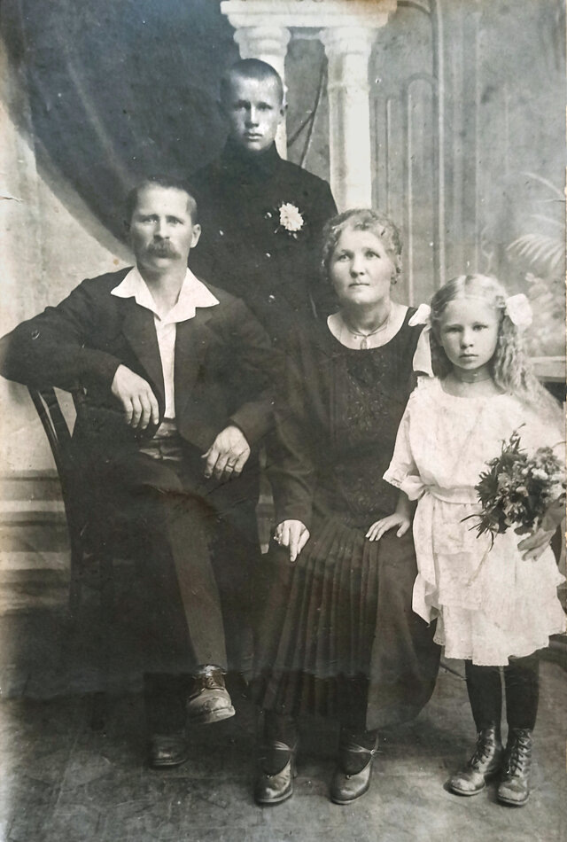 За ними стоит их первенец, сын Александр, рожденный в Ишиме в 1910 году, слева от матери – дочь Зоя, она родилась 18 декабря 1918 года. Судя по фото, семья не бьётся в тисках нужды, ну, не голодает точно. Войны закончилась, власть Советов победила и укрепилась, на дворе НЭП, массовые репрессии ещё не начались. Но скоро всё поменяется…