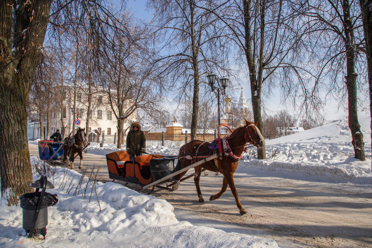 Лошадки в Суздали. Это как визитная карточка городка в котором полностью отсутствует городской транспорт. Во всяком случае в его заповедной части. Поэтому от монастыря к монастырю туристы иногда передвигаются зимой на санях. Монастырей там несколько и некоторые их них остаются музеями.