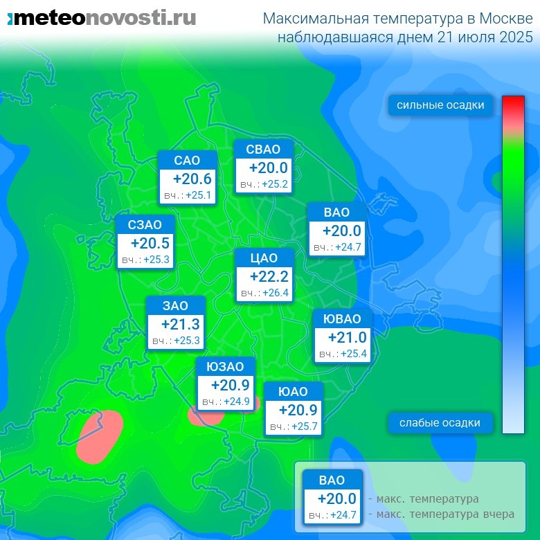 Самая высокая температура +22.2°C была зафиксирована в 17 часов в центре города, а холоднее всего было на юго-востоке: +19.0°C. Разница по максимальной температуре в разных частях столицы составила за день 3.2°C.
