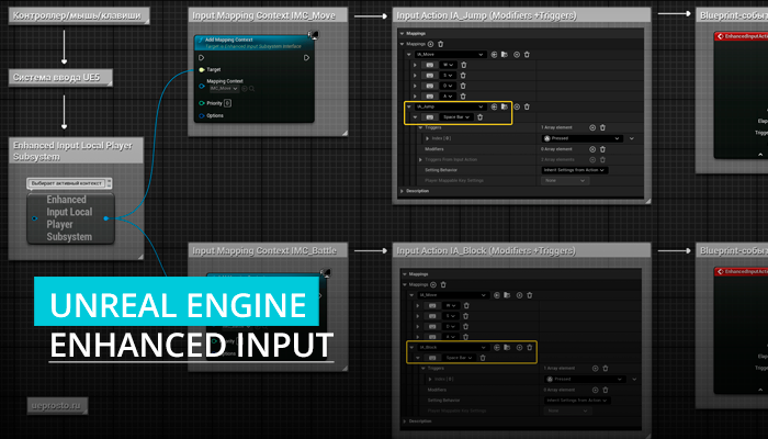 Разбираем Enhanced Input — современную систему обработки ввода в Unreal Engine, которая оперирует не клавишами и осями, а абстрактными игровыми действиями и контекстными картами. Рассмотрим сам процесс работы и ключевые элементы системы: Подробный разбор улучшенной системы ввода UE5 в статье на сайте: Enhanced Input * * *