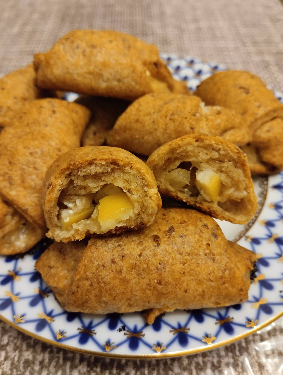 Добрый день. Сегодня хочу поделиться рецептом из детства, единственное, я заменила обычную муку в/с на цельнозерновую. Нам понадобится для теста: - 180 гр. сливочного масла; - 200 гр. творога ( я использовала жирностью 9%, можно и 5%); - 230 гр. цельнозерновой муки ( я использовала муку "Французская штучка", если будете использовать обычную муку в/с уйдёт немного больше, около 250гр.); - щепотка соли; - 1/2 ч. л. соды. Я делала творожные трубочки с лимоном и с клюквой, вы можете использовать любую другую начинку. Приготовление: Смешать творог с маслом. Добавить в муку соль и соду, смешать с творожно- масляной массой. Тесто не должно прилипать к рукам, разделить его на 4 части и скатать в шар, рисунок 3. Убрать в холодильник на 1 час. Далее достаём тесто из холодильника и раскатываем каждый шар. В центре посыпаем сахаром, кладём начинку, как показано на рисунке 4, 5. Сворачиваем трубочкой, как показано на рисунке 6. Выпекаем при 180 градусах 20-25 минут. Трубочки получаются оче