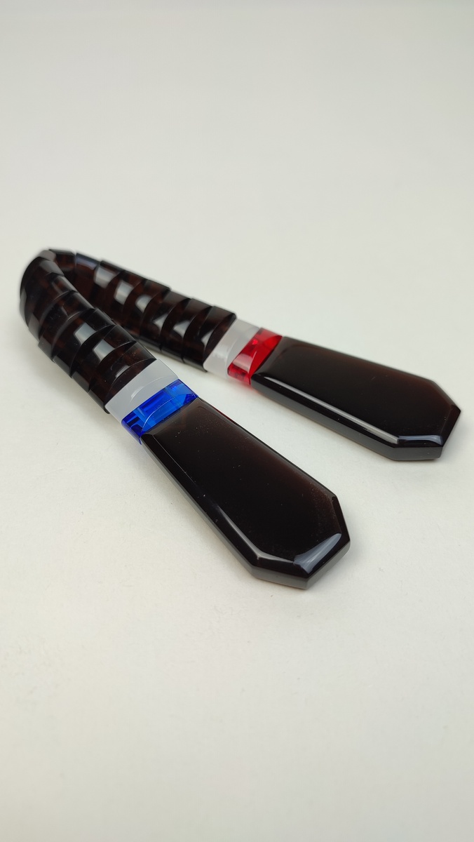 толщина ~ 8-8,5 мм. Основной цвет — чёрный, сдержанный и строгий. Молочные вставки смягчают переходы, не перегружая образ. Всё гармонично, всё на своих местах. Однако основной акцентной идеей выступают рубин и сапфир — словно напоминание, что решение всегда остаётся за тобой. Вращаются плавно, в движении ведут себя сбалансировано и уверено. Чётки, к которым быстро привыкаешь и уже не хочется оставлять дома!)