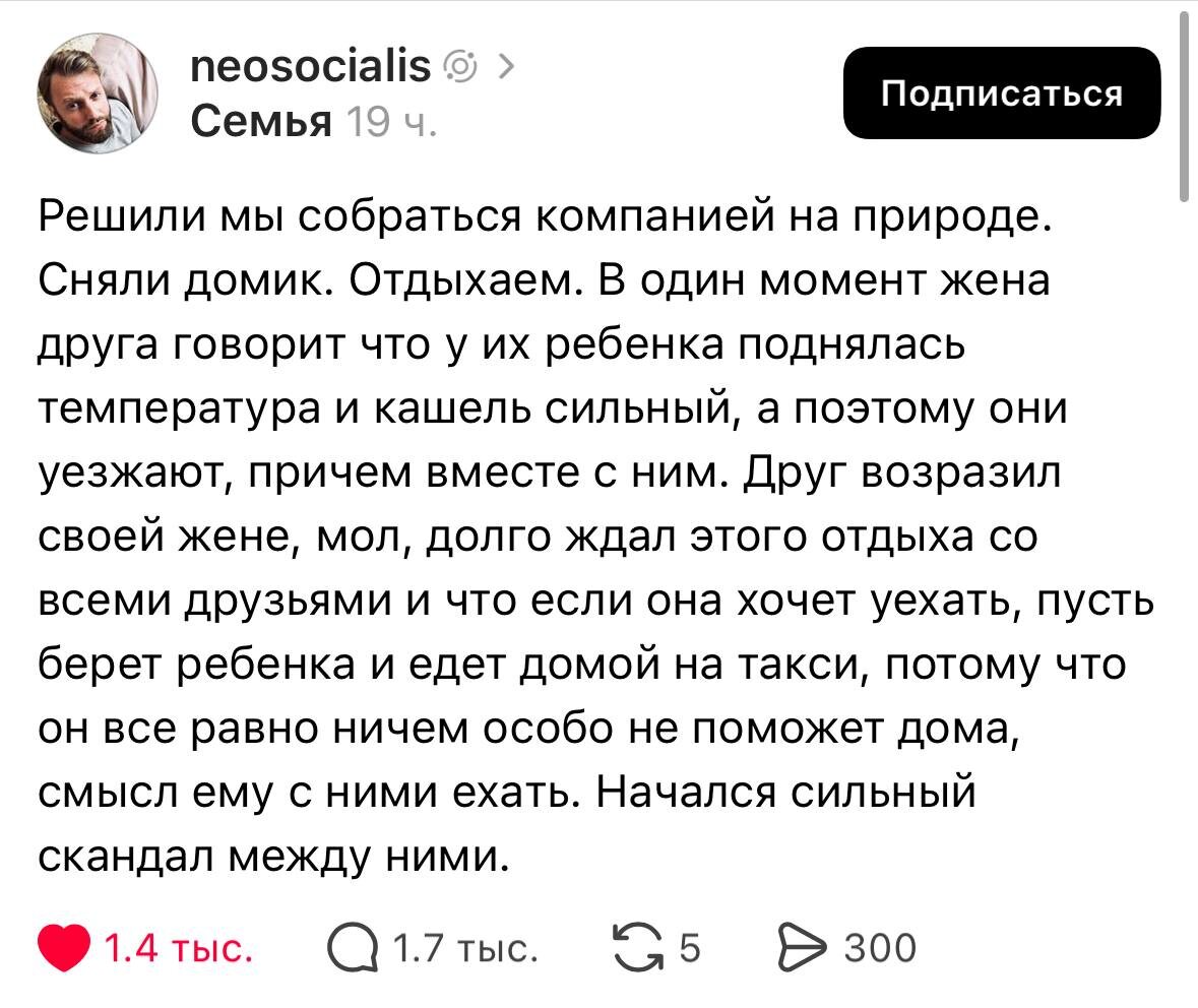 В сети обнаружен новый предмет споров. Коротко: во время отдыха семьями на природе у одной из пар заболел ребенок. В итоге супруги поссорились из-за того, что папа поначалу отказывался ехать с мамой и малышом домой, поскольку он очень ждал этого отдыха. В комментариях многие встали на защиту мужчины, обвинив его супругу в эгоизме. А на чьей стороне вы? 🇷🇺 В Стране. Подписаться