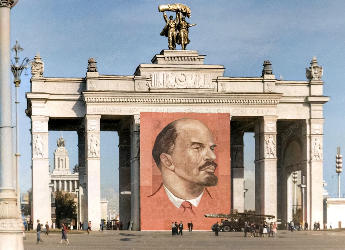 Главный вход на ВДНХ с портретом В.И.Ленина. Москва, 1969 год.