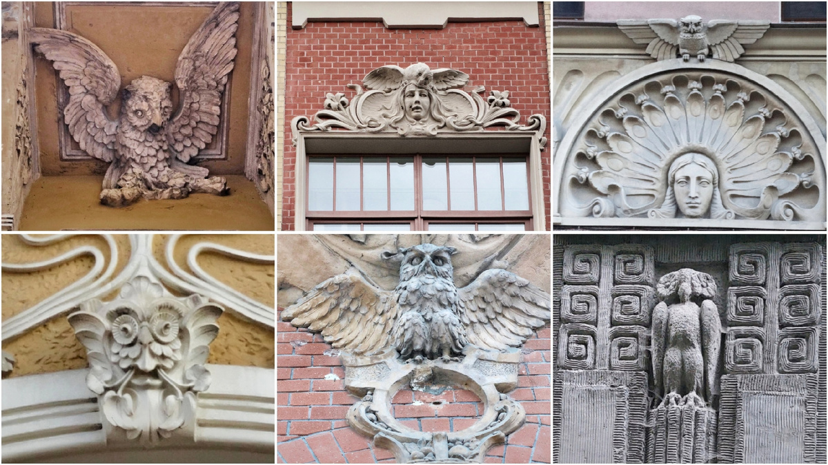 Основная ставка в декоре дома явно сделана на ленту из скучно повторяющихся горельефов по всему периметру первого этажа. Тут мы видим фигуры сов, двуглавых орлов и женские маскароны, которые, по видимому, задуманы как изображения богини Афины (на это намекают совы), но своими венцами из перьев больше напоминают "вождей краснокожих".