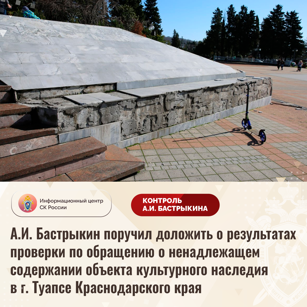 А.И. Бастрыкин поручил доложить о результатах проверки по обращению о ненадлежащем содержании объекта культурного наследия в г. Туапсе Краснодарского края К главе СК России А.И. Бастрыкину в его приёмную «ВКонтакте» обратился житель Краснодарского края по вопросу ненадлежащего содержания объекта культурного наследия регионального значения – «Памятника защитникам г. Туапсе в годы гражданской и Великой Отечественной войн, 1969 г.», установленного на площади Октябрьской революции в городе Туапсе. На протяжении длительного времени монумент находится в непригодном состоянии: облицовочные плиты частично отсутствуют, в них образовались трещины, обелиск имеет повреждения. Однако профильными структурами мер к организации реставрационных работ не принимается. Ситуация освещалась в социальной сети. В СУ СК России по Краснодарскому краю по поступившему обращению организована процессуальная проверка. Председатель Следственного комитета Российской Федерации Александр Иванович Бастрыкин поручил руко