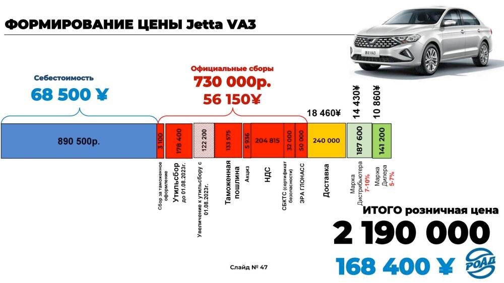 «Китайцы» станут ещё дороже — депутаты Госдумы хотя обложить дополнительными пошлинами Cherry, Geely, Zeekr и другие авто. Причина типичная: защита интересов АвтоВАЗ-а и других отечественных производителей, которые не могут в конкуренцию. Для понимая абсурда: примерно 65% стоимости китайского авто прямо сейчас — налоги, пошлины и прибыль продавца. Например, Jetta VA3 стоит в Китае 900 000 рублей, а после импорта в Россию — 2,2 млн рублей.