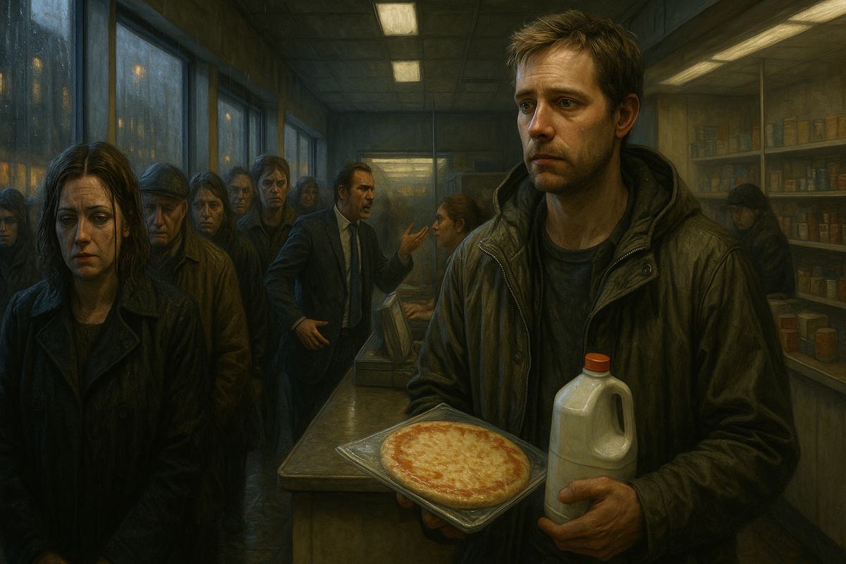 Был серый, слякотный вечер. Люди в очереди выглядели так, будто вся тяжесть мира легла им на плечи — усталые, раздражённые, кто-то с потёкшим макияжем, кто-то с мокрыми от дождя воротником. Он стоял в конце — с замороженной пиццей, бутылкой молока и мыслью о том, что жизнь как-то совсем сбилась с маршрута.