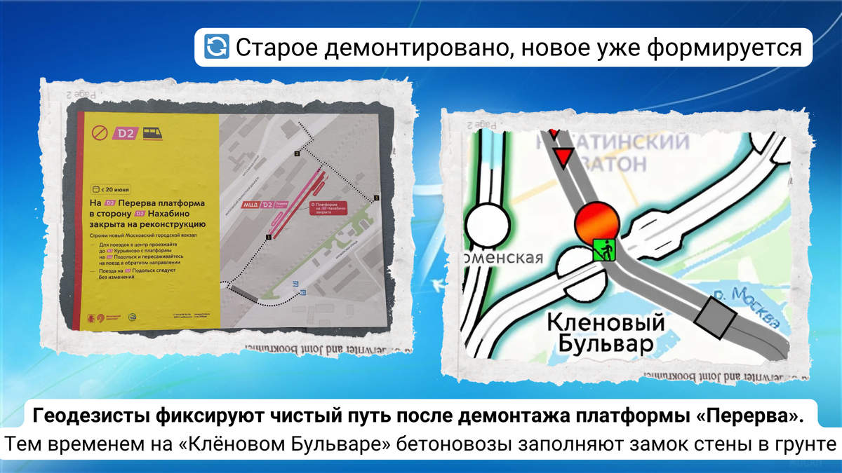 официальные отчеты. Давайте вместе разберемся, что же на самом деле происходит с нашей Москвой. Поехали? Во-первых, спешим сообщить, что завершëн демонтаж платформы для поездов «в центр» на 🚊станции «Перерва» МЦД-2. Во-вторых, окинем взором площадку 🚇 станции «Кленовый Бульвар» 🏭 Бирюлëвской линии. 📷 1.1: Ведётся заливка бетоном верхней части стены в грунте в центральной части котлована будущей станции. 📷 1.2: Ограждение котлована для монтажа тоннелепроходческих комплексов (проходк
