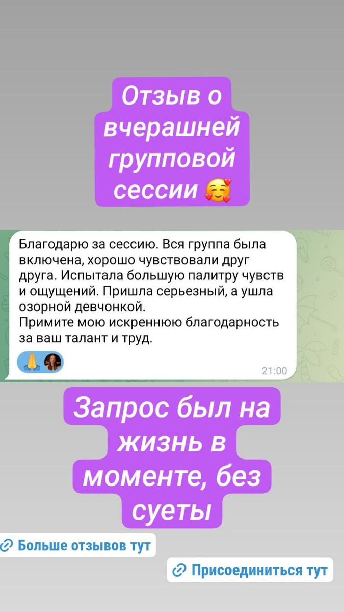 ❣Взяла на себя ответственность за сбор и публикацию отзывов! 💪 Получила очень необычный нейрографичный 🤭 отзыв - см. фото. 23.07.25 с 16:00 до 17:30 (18:00) проведу групповую расстановочную сессию с Точкой Сборки на тему "Ответственность за свою жизнь". Найдём и устраним причины безответственного, инфантильного поведения, освободимся от страхов свободы, вернём пульт от жизни. Оплата по сердцу от 777 руб + отзыв. Запись выложу на YouTube и Rutube. Посмотреть темы, записи и отзывы с предыдущих 24-х сессий можно в этой группе. Зовите друзей и подруг, чтобы больше счастливых людей стало вокруг! 🤗 (ссылка для приглашения: https://t.me/+0Jg0Wig90k5iYzAy) Желаю каждому взять ответственность за свою жизнь, чтобы обрести свободу жить жизнью мечты! ✨ #ответственность, #отзывы